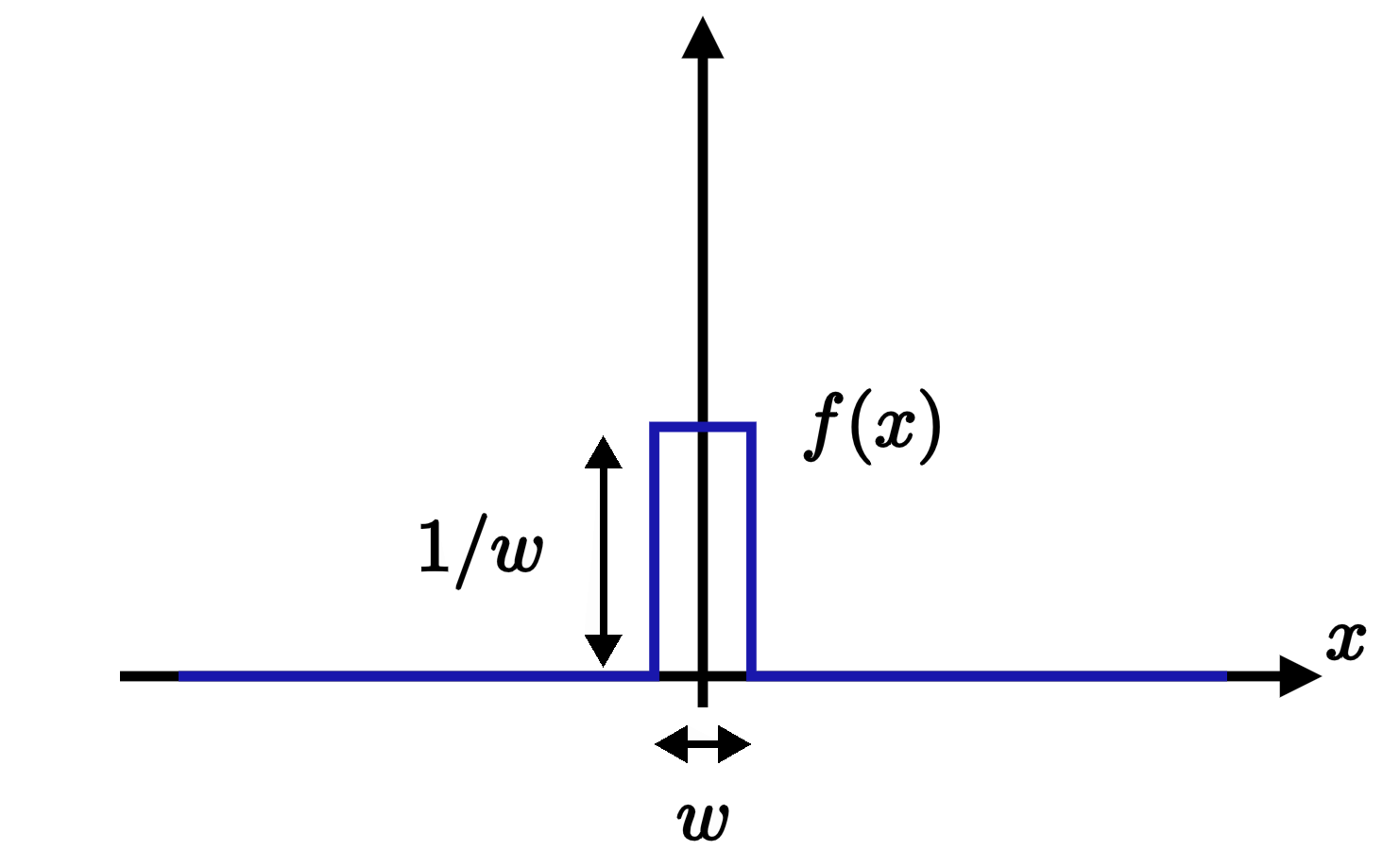To begin with, here's a sketch of the basic idea. Picture a simple rectangular function $f(x)$ of width $w$ and height $1/w$. The area underneath it—in other words, the integral of $f$—is then always equal to one, regardless of what we choose for $w$: