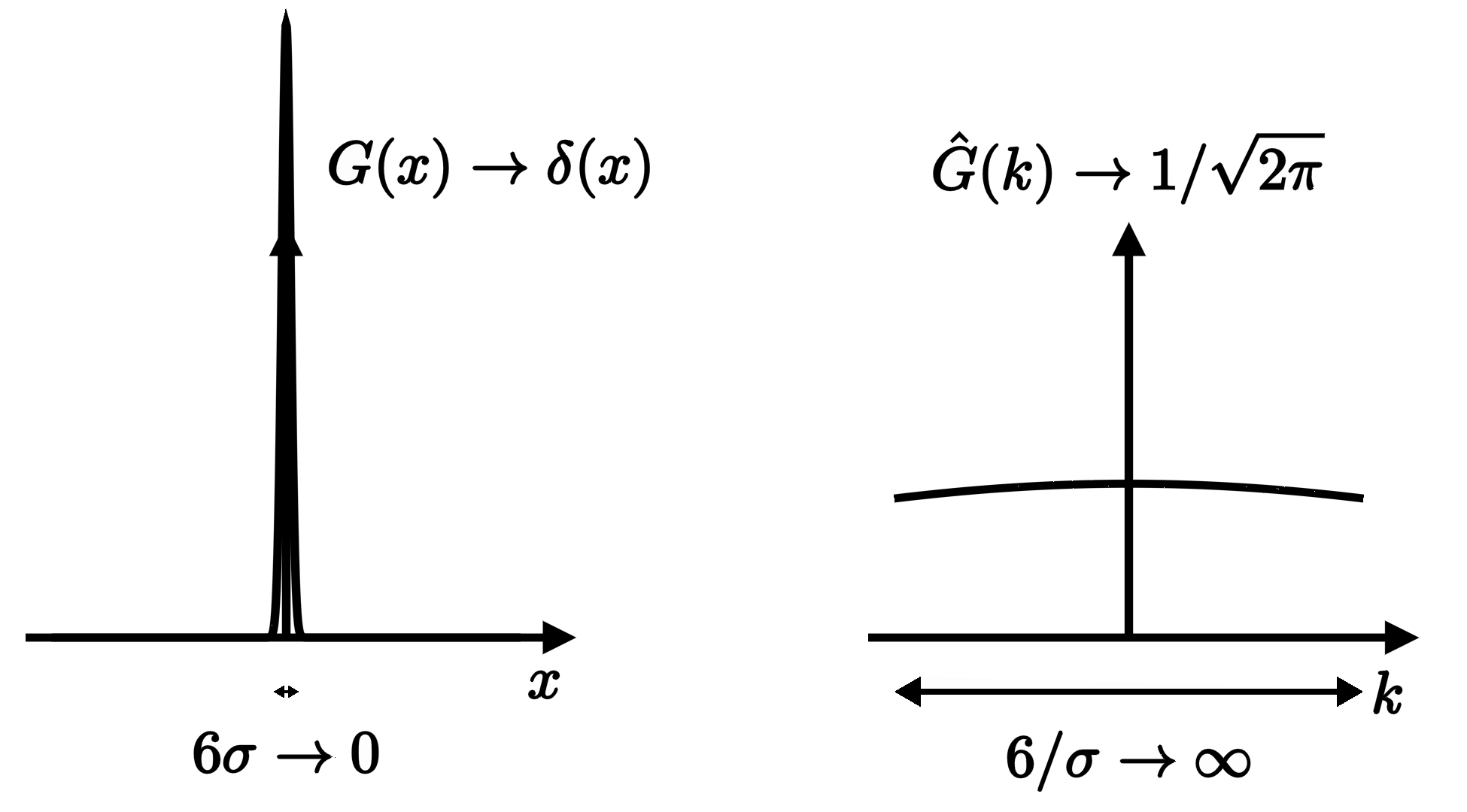 In fact, if we once again take the limit where $\sigma$ shrinks down to zero size, $G$ gets squished to an infinitesimally narrow spike at the origin as it approaches the delta function, whereas $\hat G$ flattens out and simply approaches a constant: $1/\sqrt{2\pi}.$