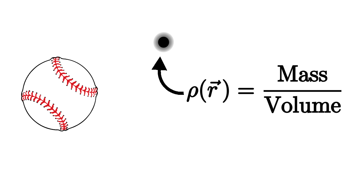So far so good. But very often in physics, we deal not with finite-size objects, but with point-like particles. So what happens to our density function in the limit that the ball shrinks down to become infinitesimally small?