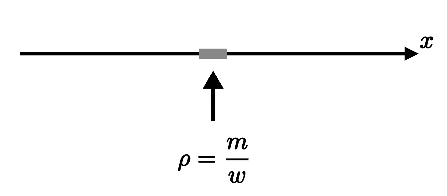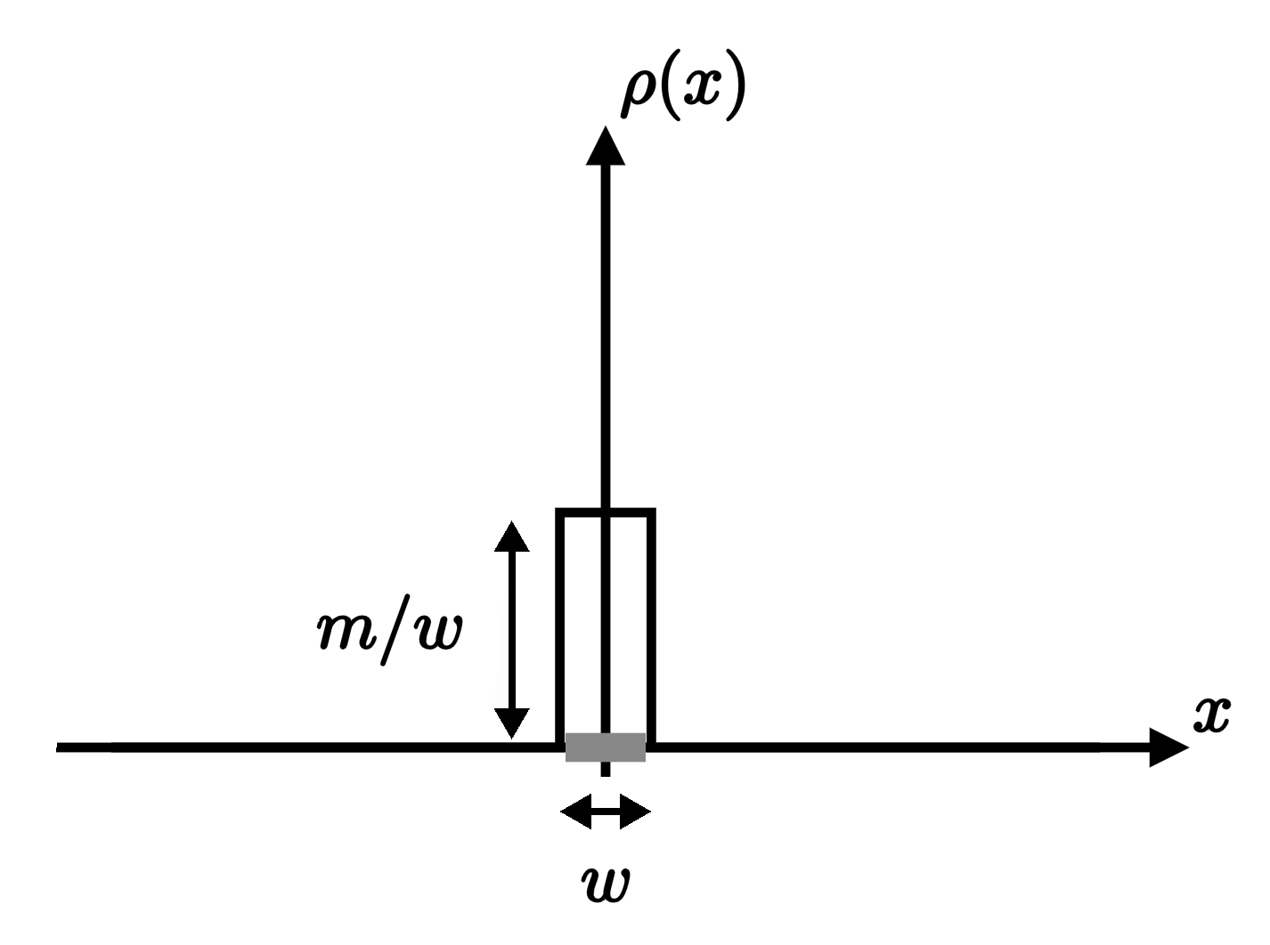 If we make a plot of the density $\rho(x)$ as a function of $x$, it's equal to zero everywhere outside that tiny strip, where it suddenly jumps up to the constant value $m/w$ inside. And, when we integrate the density function over the whole line, it once again computes the total mass, $m$: