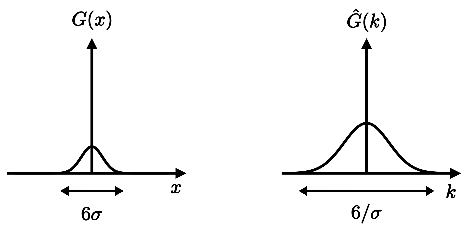 There's a key difference between the two, though. Whereas our original function had standard deviation $\sigma$, its Fourier transform has standard deviation $1/\sigma$. Meaning that if our original curve was very narrow in $x$-space, its transform will be very broad in $k$-space, and vice versa.