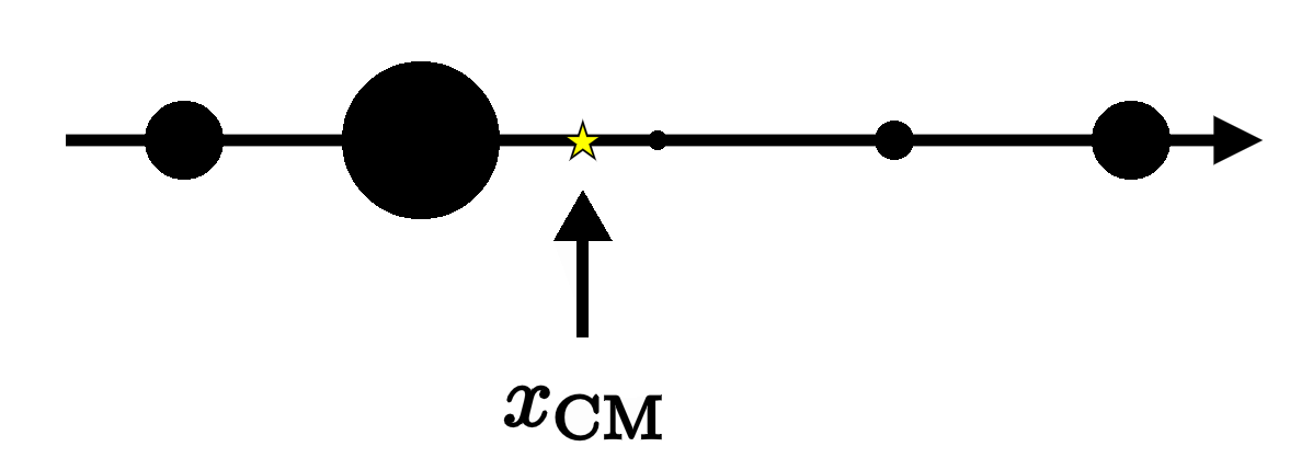 To see an application of the sifting property in action, suppose we have a distribution of multiple particles on a line, and we want to determine the location of their center-of-mass. To start with, we can write down the total density function by adding up a series of delta functions—one at the location of each particle: