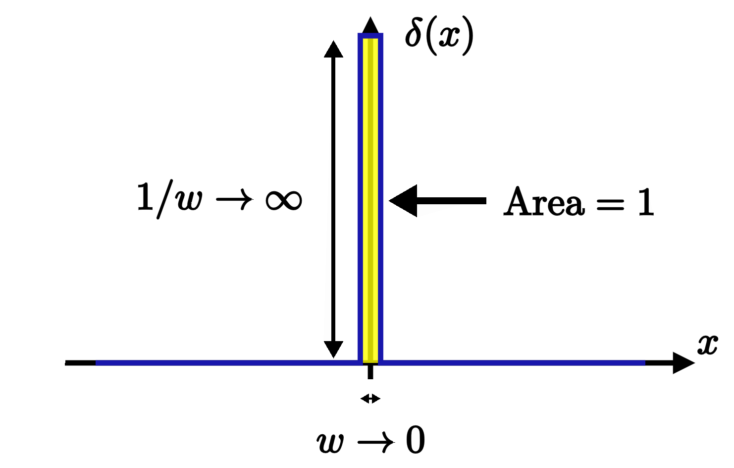And now we can see what happens when we let $w$ shrink down to zero size, representing a point particle sitting at the origin of our 1D space. The density function becomes an infinitesimally narrow, infinitely tall spike—but still with that same fixed area of $m$ lying beneath it.